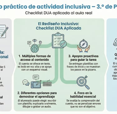 Como hemos visto en el checklist, el objetivo no es crear tres versiones de una actividad (la "fácil", la "media" y la "difícil"), sino una única actividad con múltiples puertas de entrada (Acceso), diversas rutas de salida (Expresión) y andamios integrados para todos (Apoyo). Cuando el diseño mejora, muchas “dificultades” desaparecen solas porque, en realidad, eran barreras que habíamos creado sin darnos cuenta. El DUA no va de hacer más trabajo, sino de pensar mejor el trabajo desde el principio.