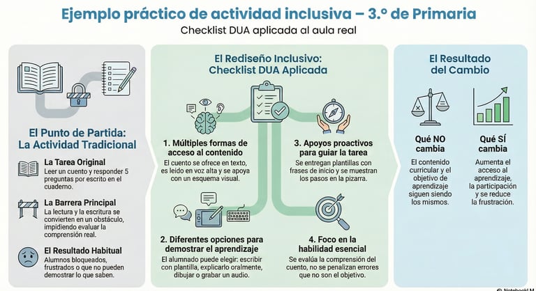Una actividad inclusiva no es la que lo tiene todo, sino la que elimina lo que sobra. Es aquella que facilita el acceso, la comprensión y la participación sin añadir obstáculos innecesarios que desvían del objetivo de aprendizaje.