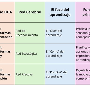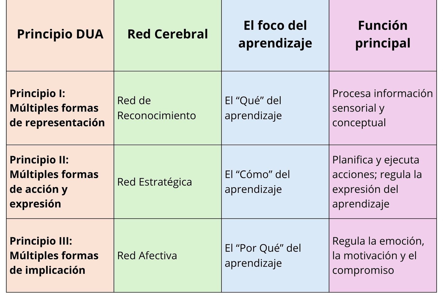 El DUA se estructura en torno a tres principios fundamentales, cada uno asociado a una red neuronal distinta involucrada en el proceso de aprendizaje: