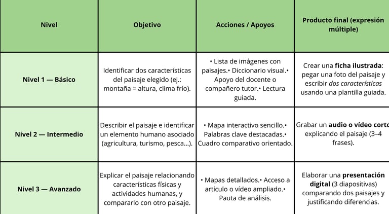 Una de las estrategias más potentes que emanan del DUA es la "enseñanza multinivel". Consiste en diseñar una actividad común que todo el alumnado puede trabajar simultáneamente, pero a diferentes niveles de complejidad, según sus capacidades y ritmo. Veamos un ejemplo práctico en una clase de Ciencias Sociales en Educación Primaria.