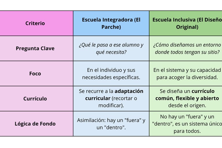 Aunque suenen parecido, "integrar" e "incluir" representan dos filosofías educativas opuestas. La integración fue un primer paso necesario, pero la inclusión es un cambio de sistema total. Esta no es una diferencia sutil, sino un abismo práctico y metodológico. La siguiente tabla compara ambos enfoques: