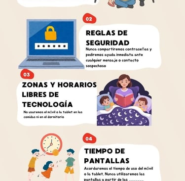 Es un documento visual que establece normas y compromisos consensuados entre adultos y menores. A diferencia de la Mediación Restrictiva —que se limita a prohibir y controlar externamente—, la mediación activa busca generar pensamiento crítico y autorregulación Se trata de una "herramienta viva" que debe adaptarse al crecimiento del menor. Para que sea efectiva, debe ser visualmente atractiva y estar redactada en un lenguaje sencillo, permitiendo que incluso los más pequeños comprendan que navegar por Internet requiere de una guía ética y práctica.