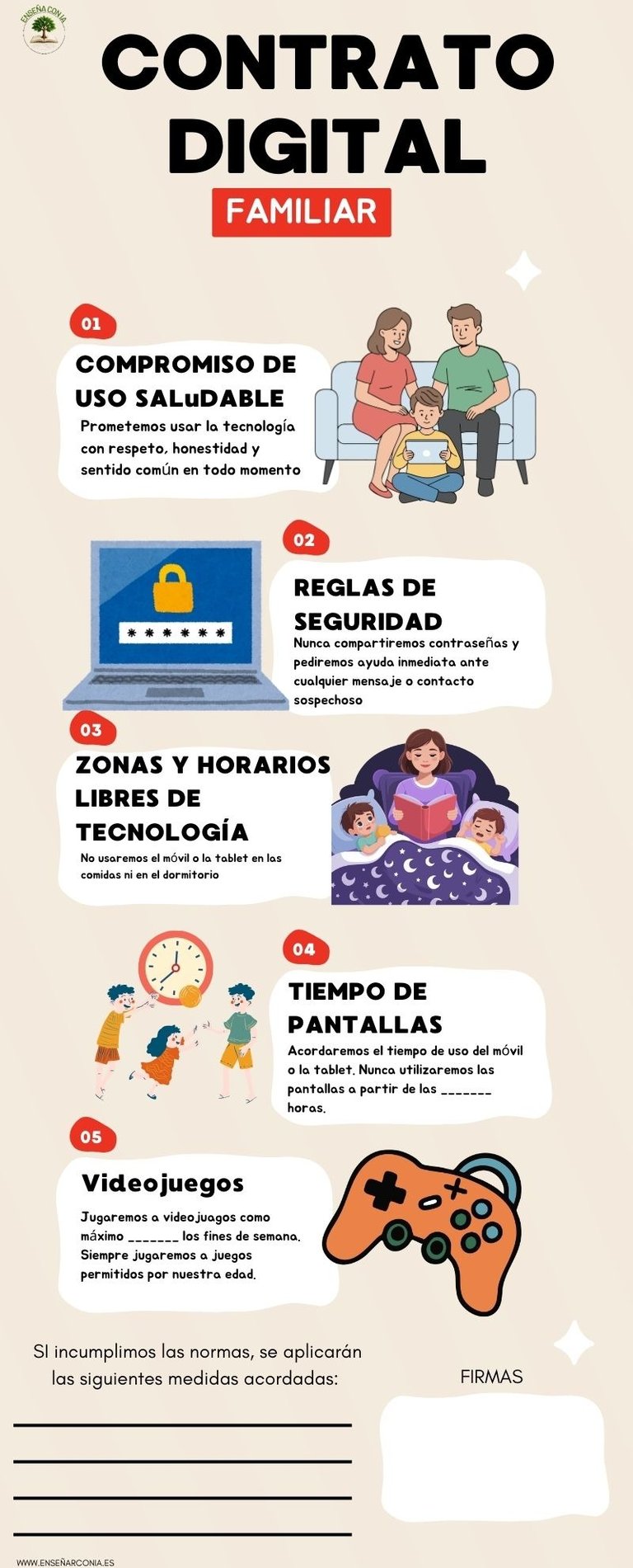 Revisión: Establezcan una cita obligatoria cada 2 o 3 meses. Los niños crecen y sus necesidades digitales cambian; el contrato debe madurar con ellos.