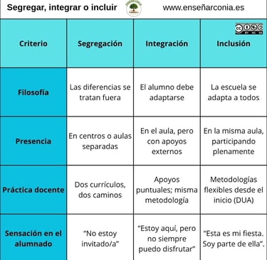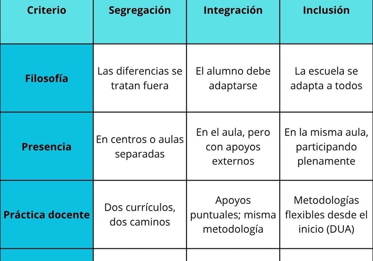 En este artículo exploramos de forma clara y práctica las diferencias entre segregación, integración e inclusión en el ámbito educativo, para comprender cómo ha evolucionado la atención a la diversidad en nuestras aulas. A través de ejemplos reales del día a día docente y del papel que juegan marcos como el Diseño Universal para el Aprendizaje (DUA) y la LOMLOE, descubrirás qué caracteriza a cada modelo, por qué la inclusión es el horizonte pedagógico actual y cómo podemos construir aulas donde todo el alumnado participe y aprenda de manera significativa.