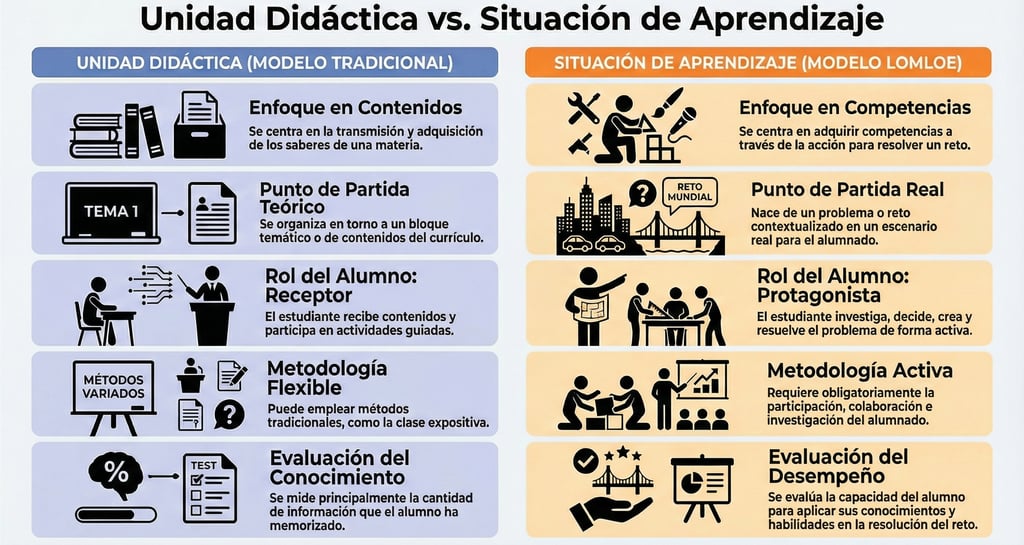 La implementación de la LOMLOE ha introducido nueva terminología en nuestra práctica docente diaria, y el concepto de la Situación de Aprendizaje (SA) es, sin duda, uno de los que más dudas ha generado. Muchos nos preguntamos si la SA es una nueva forma de nombrar a la tradicional Unidad Didáctica (UD).