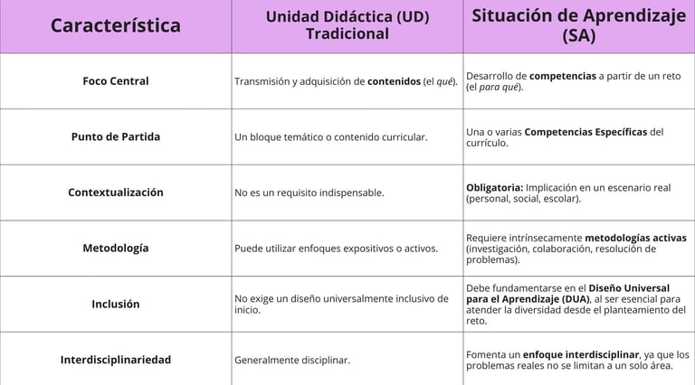 El artículo aclara las diferencias que existen entre una unidad didáctica tradicional y una situación de aprendizaje alineada con la LOMLOE y los principios del DUA.