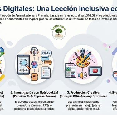 Situación de aprendizaje para Educación Primaria basada en la LOMLOE que integra el Diseño Universal para el Aprendizaje (DUA) y herramientas de inteligencia artificial. El artículo presenta un ejemplo práctico e inclusivo para 3.º de Primaria, donde el alumnado desarrolla un proyecto competencial utilizando Kahoot, NotebookLM, Canva/Book Creator y Brisk Teaching. Una propuesta clara y aplicable para docentes que buscan atender a la diversidad, diseñar actividades accesibles y evaluar de forma inclusiva con apoyo de la IA en el aula.