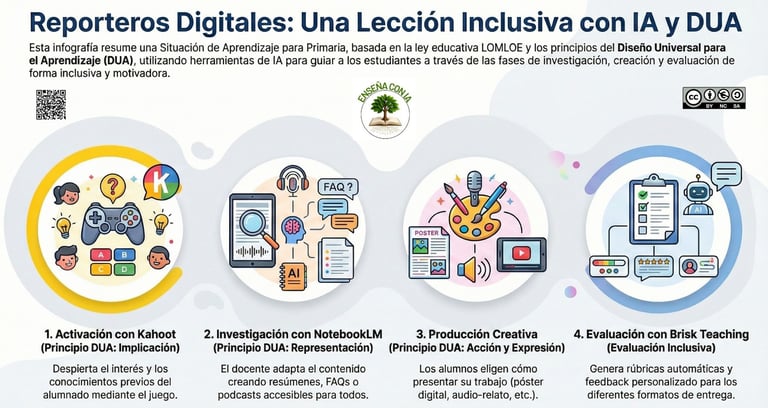 En este artículo se presenta una Situación de Aprendizaje para 3.º de Educación Primaria, titulada “Reporteros Digitales del Entorno”, como ejemplo práctico de cómo integrar el DUA y herramientas de IA en una propuesta realista, alineada con la LOMLOE y fácilmente aplicable en el aula.