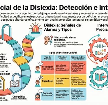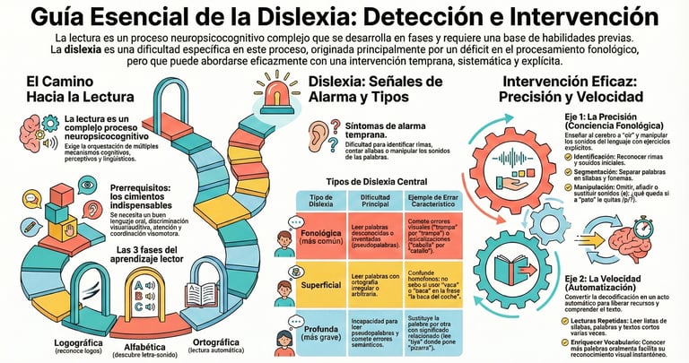 El aprendizaje de la lectoescritura es un proceso complejo que implica habilidades cognitivas, perceptivas, lingüísticas y emocionales. Comprender cómo se desarrolla y qué señales pueden alertarnos es fundamental para una detección e intervención eficaz. Este documento sintetiza los aspectos esenciales sobre la dislexia y el papel central de la conciencia fonológica.
